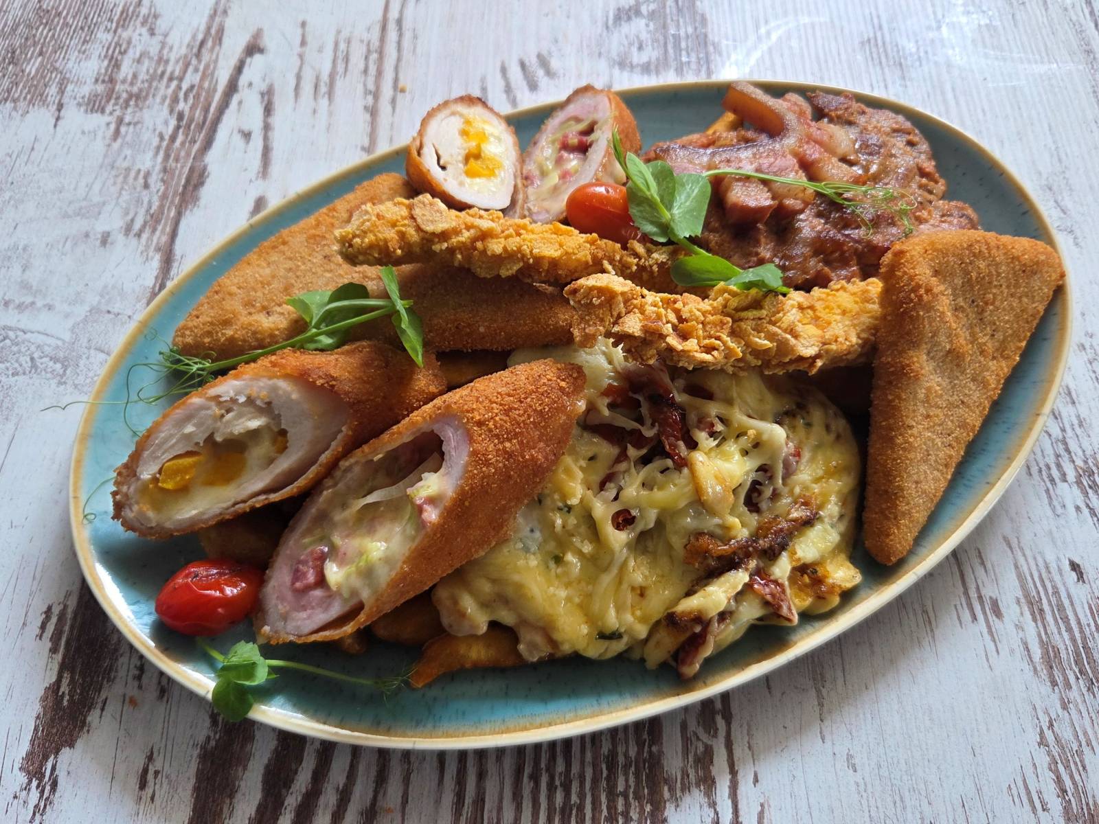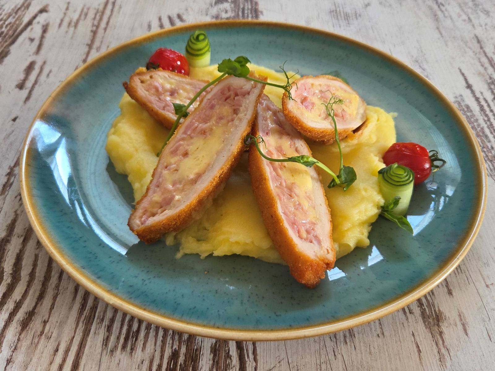 - fetával, füstölt sonkával töltött csirkemell rántva