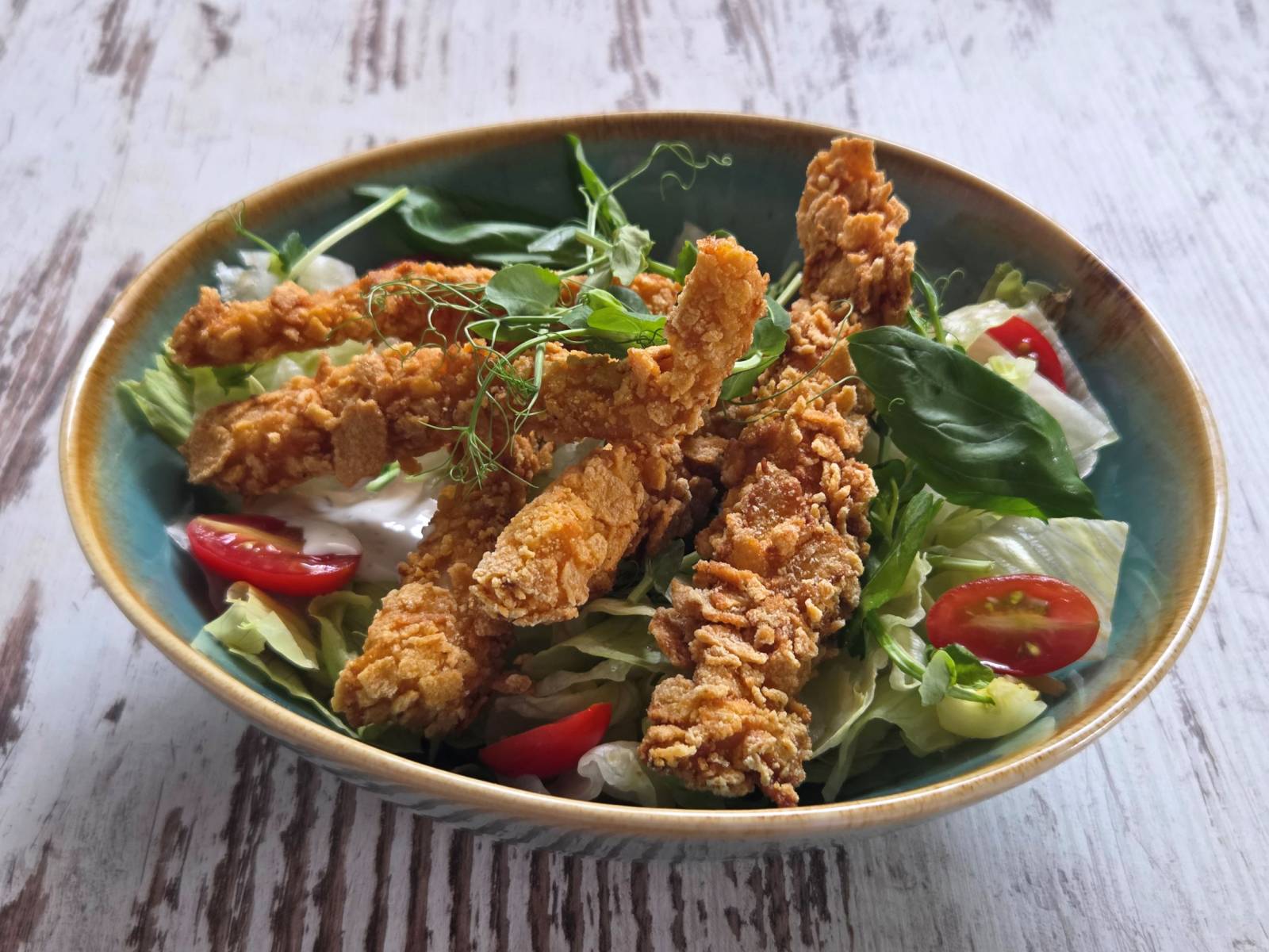 csirkemell csíkok Corn Flakes bundában rántva, jégsaláta, uborka, paradicsom, fokhagymás-tejfölös szósz