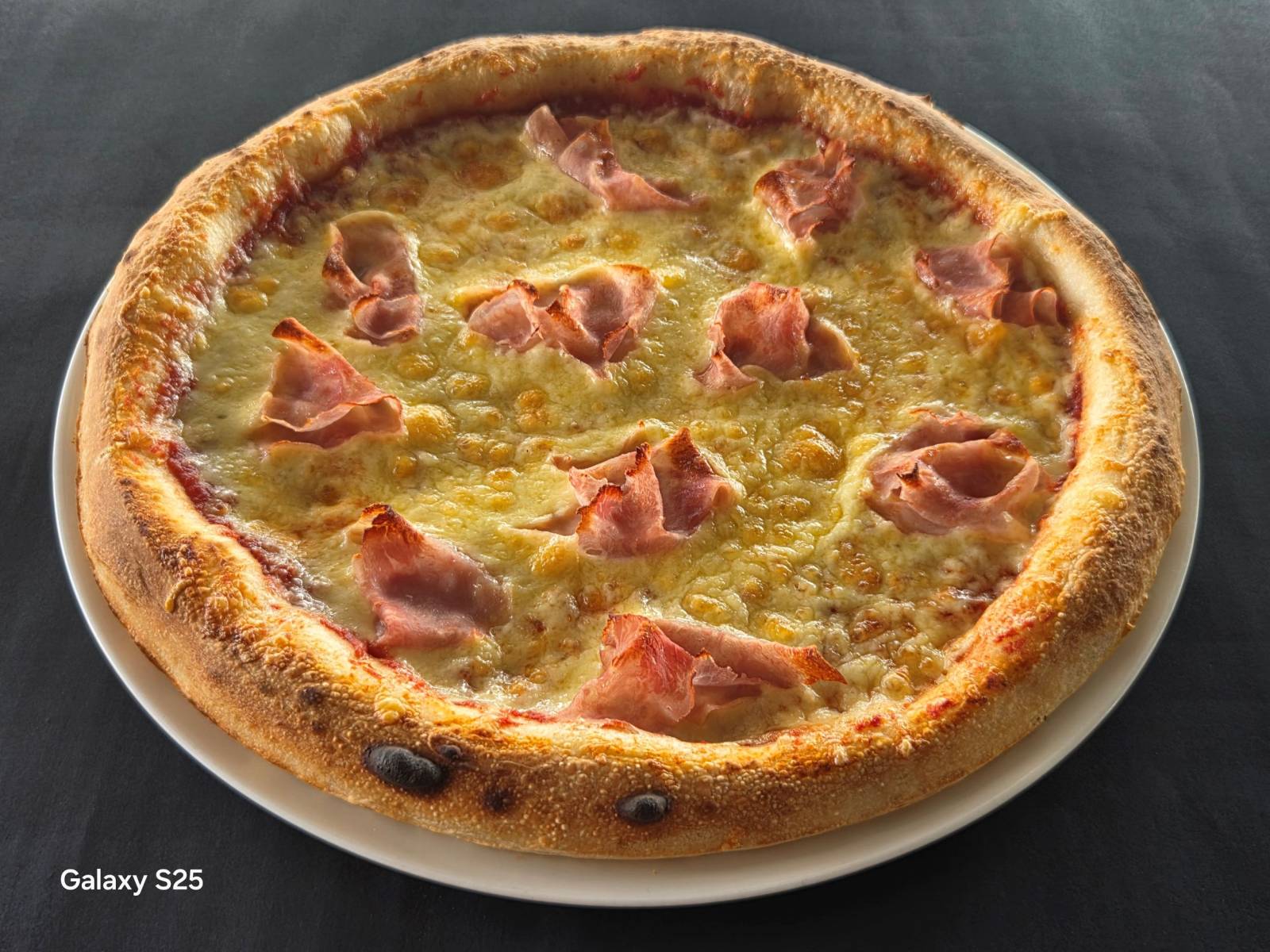 fokhagymás-tejfölös szósz, paprikás szalámi, sonka, gomba, kukorica, bacon kocka, sajt, füstölt sajt