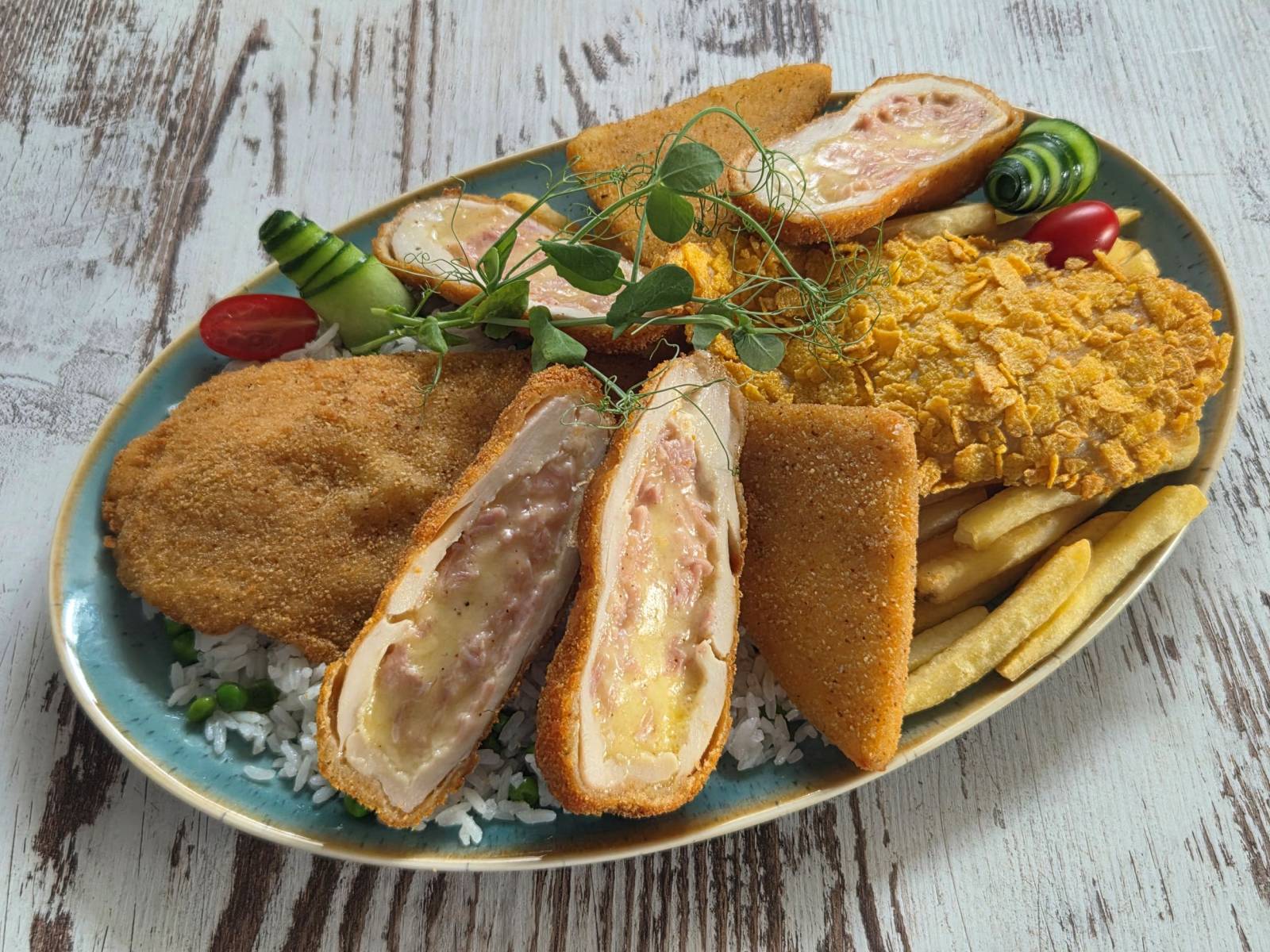rántott csirkemell 1 db, rántott sajt 2 db, rizi-bizi és tartár mártás
