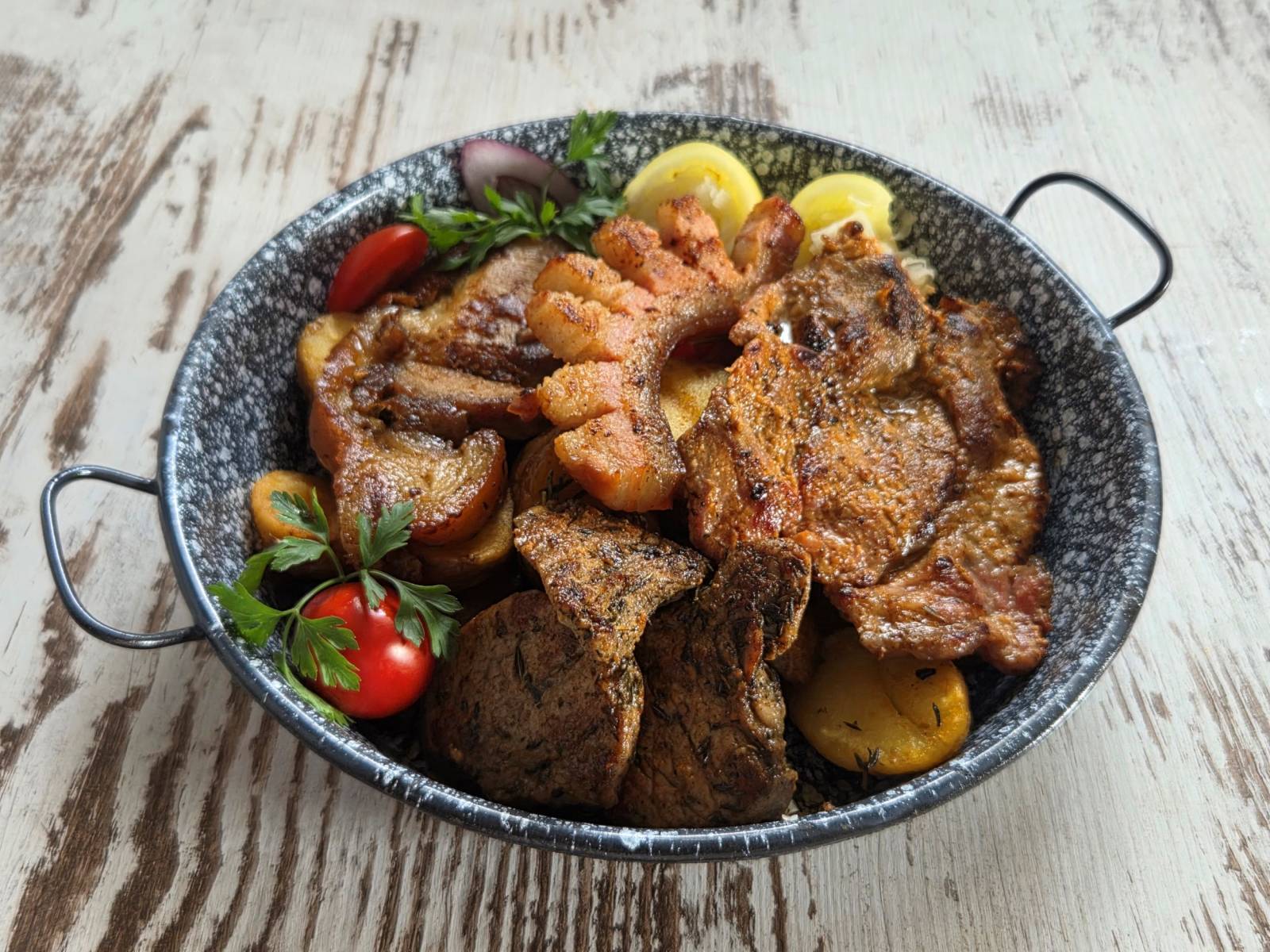 grillezett fokhagymás tarja , sült tokaszalonna , grillezett szűzérmék , lassan sütött sertés csülök , rozmaringos parázsburgonya , káposztával töltött almapaprika